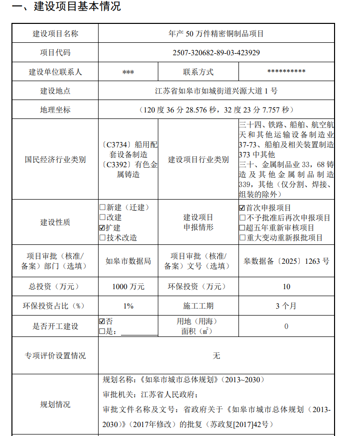 10月10日,江苏政田新材料有限公司年产50万件精密铜制品项目进入环评受理公示阶段。