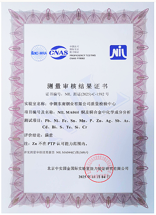 近日,东南铜业质量检验中心参加了由北京中实国金国际实验室能力验证研究有限公司组织的NILMA044铜及铜合金中化学成分分析项目。参与的16个测试项目在精密度与正确度方面均符合评价标准要求,检测结果获得“满意”评价。
