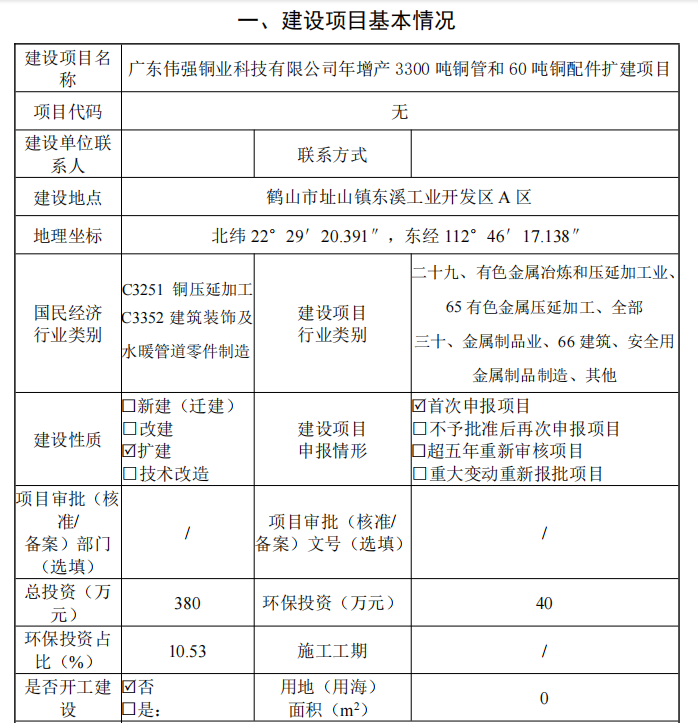 广东伟强铜业拟建年增产3300吨铜管和60吨铜配件扩建项目