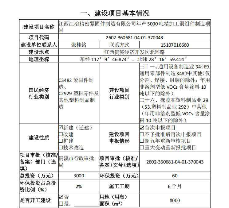 据贵溪市生态环境局网站消息,江西江冶精密紧固件制造有限公司年产5000吨精加工铜组件制造项目4月21日进入环评拟受理公示阶段。